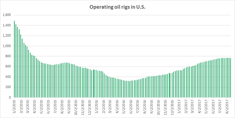 The report from Baker Hughes shows that the numbers of operating rigs in the United States declined for a 4th time in 31 weeks. In last week, there was a decrease of 5 operating rig in the US, pushing the total number to 763, the highest since April 2015. However, it has now declined to the lowest since early July this year. A separate report showed that U.S. oil production recovered to 9.5 million barrels per day, which is the highest level of production since July 2015. The production has increased by more than a million barrels per day since bottoming around last July. The International Energy Agency (IEA) recently forecasted that production is set to rise by 920,000 barrels in 2017 alone and by 780,000 barrels per day in 2018. So far, this year, production has increased by 731,000 barrels per day.