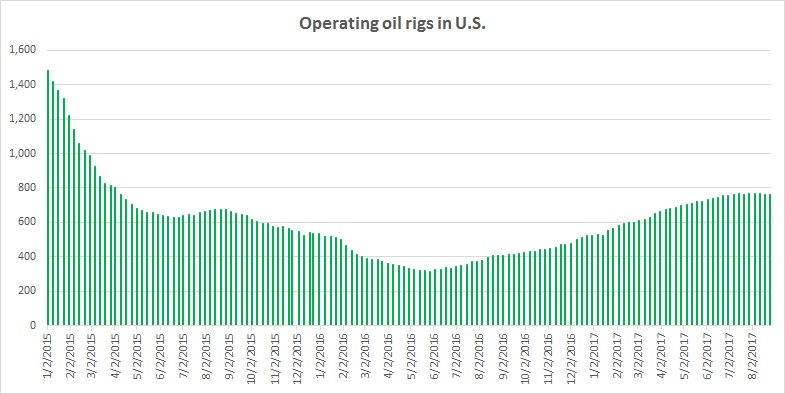 The report from Baker Hughes shows that the numbers of operating rigs in the United States declined to the lowest since June this year. In last week, there was a decrease of 4 operating rigs in the US, pushing the total number to 759. A separate report showed that U.S. oil production recovered to 9.53 million barrels per day, which is the highest level of production since July 2015. The production has increased by 1.1 a million barrels per day since bottoming around last July. The International Energy Agency (IEA) recently forecasted that production is set to rise by 920,000 barrels in 2017 alone and by 780,000 barrels per day in 2018. So far, this year, production has increased by 734,000 barrels per day.