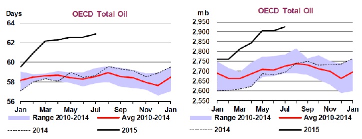 - OECD oil inventories have never been higher in history and it is still rising. Inventory at end of July was 2950 million barrels according to data from IEA. That means at current demand they are sufficient to cover 63 days for overall OECD. Days cover running highest in Europe at 68 days and cover is way above average in both Asia and US.