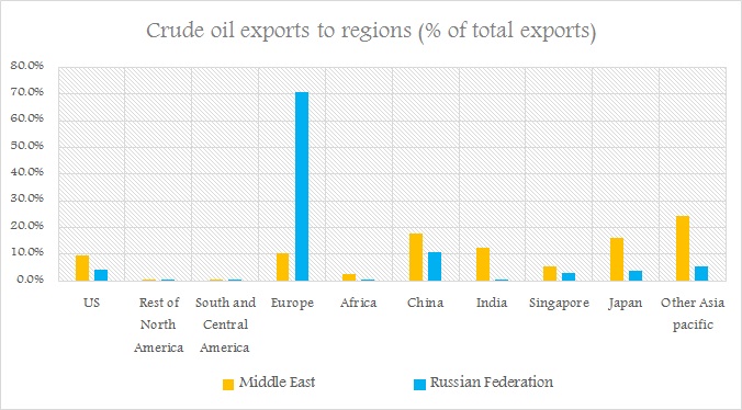 - According to latest figure available, almost 70% of Russia's (Russian Federation) crude oil exports are concentrated towards Europe.
