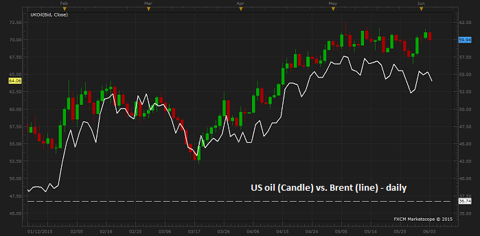 WTI crude is trading at $59.9/barrel, down from its recent high of $61.5/barrel, made yesterday. Bulls tried to make an attempt to break above the Doji highs made over the last few weeks. However the attempt failed, as traders are playing it cautiously as OPEC producers meet at summit in Vienna. Brent WTI spread squeezed further by 60 cents, currently trading at $4/barrel.