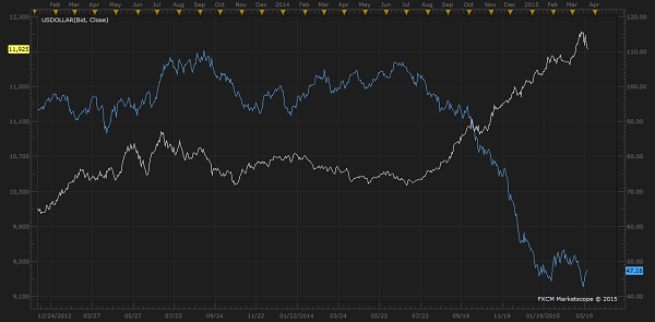 The chart above shows two contrasting securities, WTI crude oil and Dow jones FXCM US dollar Index. WTI crude is trading at 47.61, up 0.3% today. Dollar index is trading at 96.7, down 0.25% today.