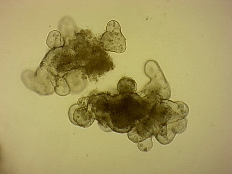 They are grown in a gel that allows them to develop three-dimensionally, so they mimic the architecture of our organs much more realistically than a simple layer of cells. Stem cells from the intestine multiply to form a ball, in which the hollow centre is like the space inside the intestine. The surface of these balls then buds outwards at various points to form pocket-like extensions. This is similar to the intensely folded surface of the gut wall.