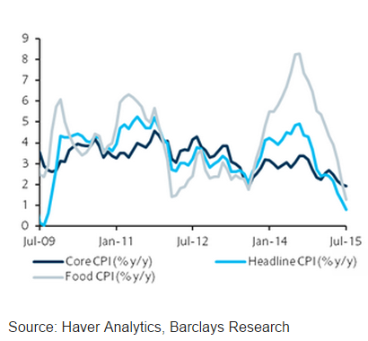 July inflation remains close to multi-year lows. Inflation is at its lowest level since the 1987, and despite poor weather conditions, overall price pressures remain muted. The drop in commodity prices, particularly crude oil, remains a strong tailwind for activity, as it has lowered inflation considerably. Even in today's print, lower inflation was largely on the back of falling energy prices, and a high base for food inflation. Food inflation stands at 1.3% y/y, even with El Nino type weather conditions persisting. Core CPI, however, remained steady, coming in at 1.9% y/y.
