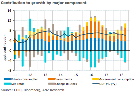 "Based on realised H1 growth of 6.3 percent y/y, we are revising our full year 2018 GDP estimate to 6.6 percent from 6.8 percent previously. This downward revision notwithstanding, we remain of the view that domestic demand conditions remain strong and are the principal cause for the deterioration in the trade balance and accelerating inflation," the report commented.