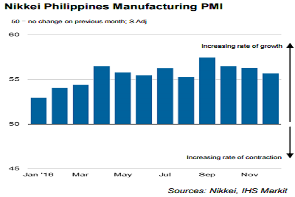At 55.7 in December, compared to 56.3 in November, the headline Nikkei Philippines Manufacturing Purchasing Managers Index (PMI) signalled another solid expansion in the Filipino manufacturing industry.