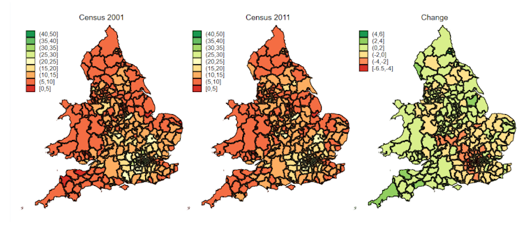 Proportion of 25 to 34-year-olds in employment who are in higher managerial, administrative and professional occupations. Census data from 2001 and 2011., Author provided