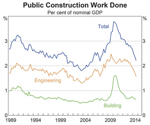 - Public construction work has fallen close to lowest levels in a decade. Public sector building construction has fallen below 1% of GDP.