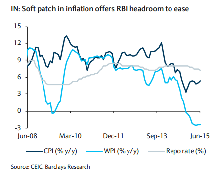 "We look to the RBI's commentary and guidance next week to firm our views in this regard. However, given the ongoing soft inflation backdrop, the risk of a 25bp repo rate cut by the RBI in H2 15 is rising, in our view," notes Barclays.