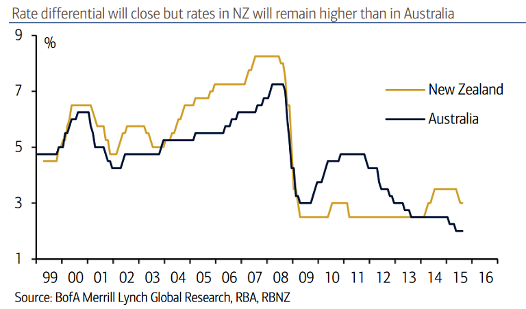 "We expect the RBA will have rates at 2% and the RBNZ at 2.75% by the end of this year", says BoFA Merrill Lynch in a research note.