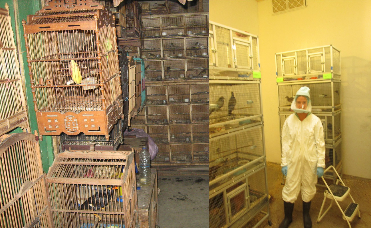 A live-animal market in Indonesia (left) and an artificial market established to study interspecies transmission of avian influenza viruses as viewed through the window of a biosafety containment level 3 room. Richard Bowen, CC BY-ND