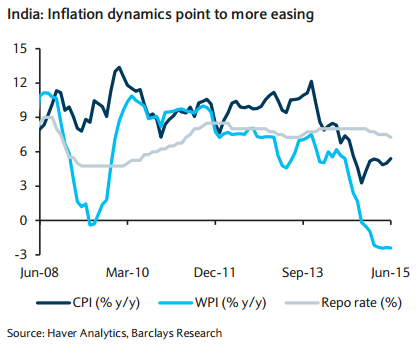 The RBI noted that "...Significant uncertainty will be resolved in the coming months, including the likely persistence of recent inflationary pressures, the full monsoon outturn, as well as possible Federal Reserve actions. As the Reserve Bank awaits greater transmission of its front-loaded past actions, it will monitor developments for emerging room for more accommodation." Indeed, while the RBI has lowered the repo rate this year (75bp during H1 2015), it has of late, emphasised three key risks: 1) below-normal monsoon rains; 2) uncertainties around crude oil prices; and 3) volatility in the external environment.