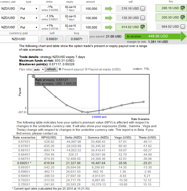 Sell NZD/USD 7D (+1%) In-the-Money put option and simultaneously buy 7D (-1%) Out-Of-The-Money delta put option and 7D (-1.5%) Deep Out-Of-The-Money put option.