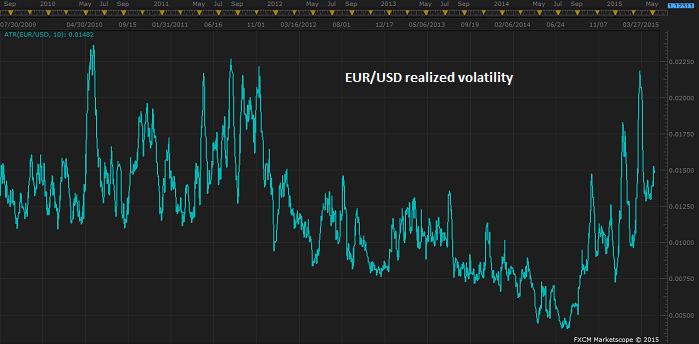 - Volatility clustering indicates that volatile days are not over. Euro realized volatility this year touched highest level since 2011 debt crisis. Chart is attached for reference. European Central bank's QE isn't depressing volatility unlike that of Federal Reserve's as Market remains tense over Greece and Fed rate hike prospect.