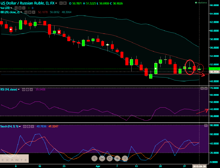 On daily chart back to back bearish shooting star candles occurred on short term upswing which is displaying a long upper shadow and its small real body is at or near the lows of the session. RSI (14) also gives an early signal of divergence with price curve. Overall, a short term fall in this pair is expected certainly until it seeks strong support at levels around 49.7928. One can see shorting chances here.