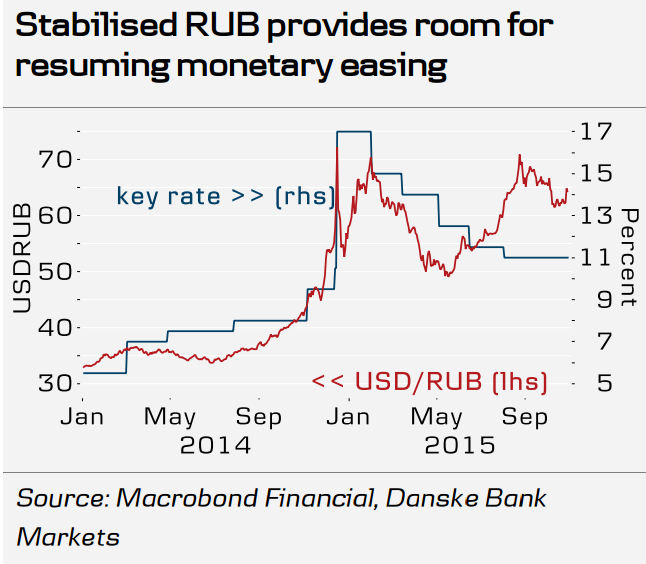 Russia's central bank (the CBR) will announce its monetary policy decision this friday at 11.30 CET. The key rate is expected to be lowered by 50bp to 10.50%, while consensus is split between a 50bp cut and no change. It is believed that the CBR will resume its monetary easing after a pause in September 2015, as inflation acceleration has stopped after a marginal rise in August 2015 when Chinese woes weighed on the RUB and consumer prices.