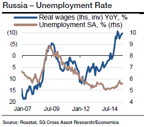 "In terms of wages we do not anticipate material revision of the wage bill - unless oil prices rise higher than $50 per barrel of Brent on a consistent basis (which is likely to occur in Q1 16). In September the real income will be mainly driven by a marginal improvement in the inflation backdrop vs the first two months of Q3 15, so that we anticipate the final printing of real wages to be a little bit better at -9.5% yoy than that of August (-9.8% yoy)", states Societe Generale.