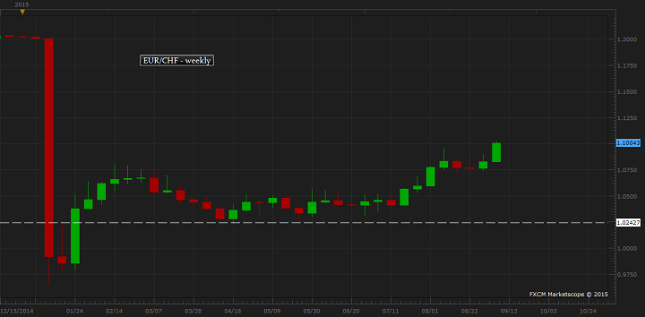 Euro has strengthened beyond 1.10 against Franc, strongest point since EUR/CHF floor was removed by Swiss National Bank.