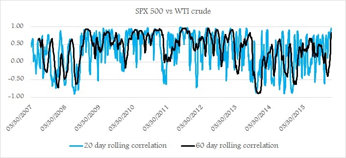 As the figure shows, 20 day rolling correlation has been reaching to new heights not seen for years. Last time S&P 500 was this related to oil price was back during 2013. 20 day rolling correlation between S&P 500 and WTI crude just reached 97%, just shy of last eight years record of 99%. 60 day rolling correlation stands at 84%, meaning in last sixty trading days, in 805 of cases S&P 500 and oil has moved in the same direction.