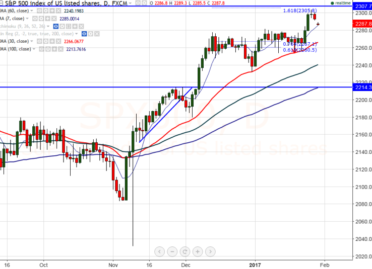 - S&P500 has shown a slight decline after forming top at 2303.80 on Jan 26th 2017. It is currently trading around 2287.