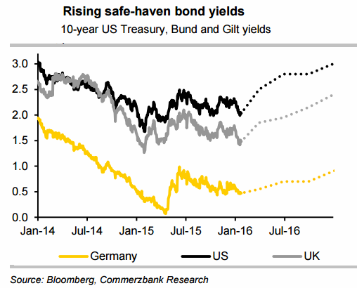 "Against this backdrop the Fed should succeed in gradually letting the air out of the bond bubble, and safe-haven bond yields are set to gradually increase. The rising relative attractiveness of sovereign bonds and the unwinding of the 'hunt-for-yield' should weigh on the returns of other asset classes resulting in years of asset price disinflation at the global level," said Commerzbank in a research note.