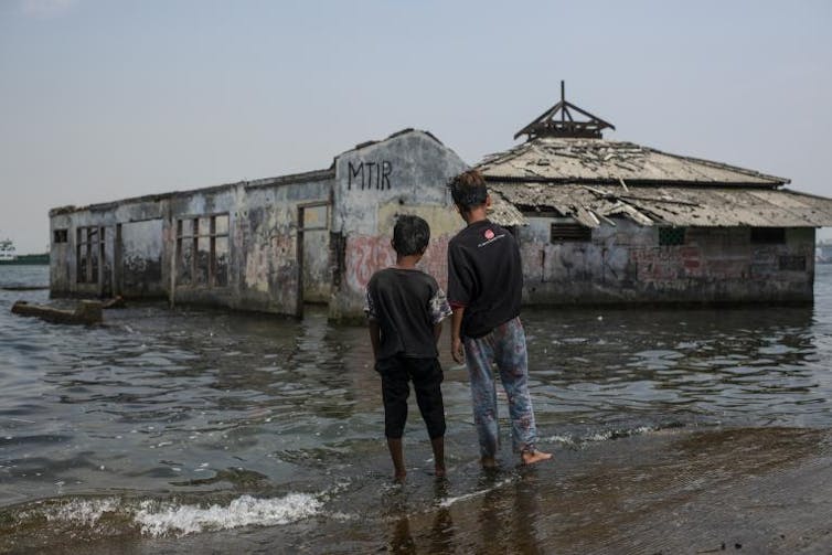 Kids look out at the partially submerged mosque in Jakarta due to land subsidence and climate change. Wilander/UNICEF