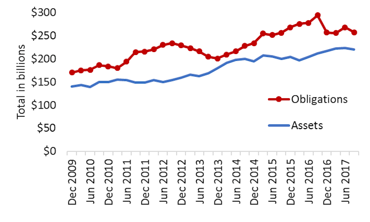 Total obligations and assets for single-employer defined-benefit pension funds in Ontario. The gap between the lines represents the overall funding shortfall. Data is from https://www.fsco.gov.on.ca/en/pensions/actuarial/Pages/solvency-funded-estimate-reports.aspx.