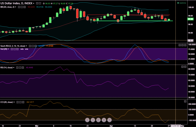 Concerns over Greece defaulting on debts provided further support to the currency. US Dollar Index made a weekly low of 96.90 and closed at 97.11 on Friday. However, the release of positive corporate earnings created a buzz on the Wall Street.