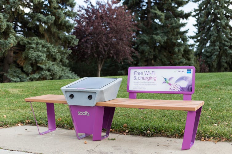 A smart bench in Edmonton. These public benches provide access to wi-fi and charging, but also collect data from nearby devices. Mack Male/Twitter, CC BY