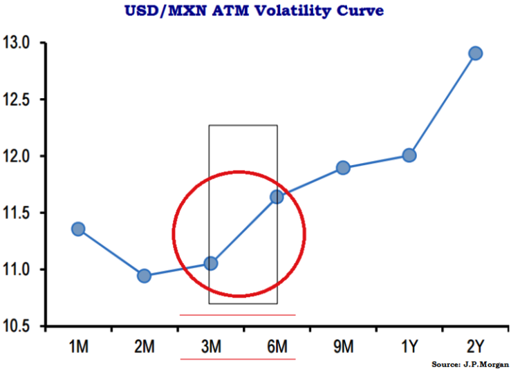 As shown in the figure, volatility curve for USD/MXN pair is steeply upward between 3M-6M segment, relatively stagnant between 6m-1Y and steep spike again beyond 1Y segment.