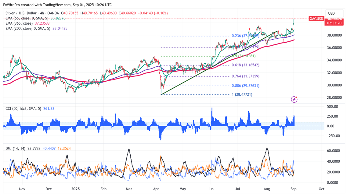 Silver hits a fresh year high on rate cut hopes. It hit an intraday high of $40.75 and is currently trading around $40.52.