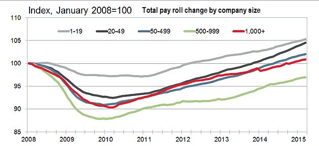 As shown in the chart, payroll gains at large companies with employee base larger than 1000, contributed not only less to pay roll gains, is yet to reach pre crisis level. Most of the gains are driven by companies with fewer than 50 employees.