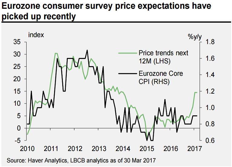 Separate data from the European Commission's monthly sentiment survey showed the eurozone consumer index of price trends over the next 12 months rose to 15.3 points from 14.5 in February, the highest since October 2013. The indicator for selling price expectations among manufacturers also rose to 9.8 points from 9.0 in February, the highest since July 2011.