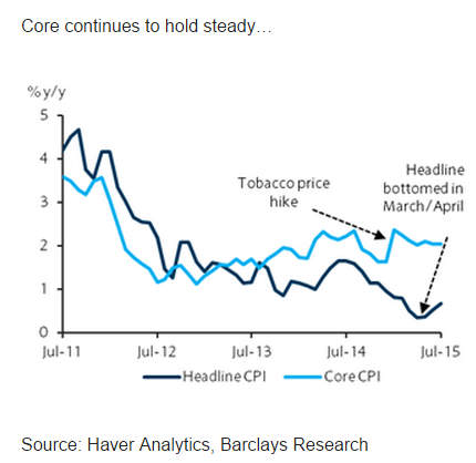 "We maintain our full year inflation forecast at 0.9% for 2015. We believe inflation remains benign and will gradually trend higher in H2. The softer-than-expected Q2 outturn has prompted us to lower our full-year GDP growth forecast by 40bp to 2.6% (BoK: 2.8%)," notes Barclays.
