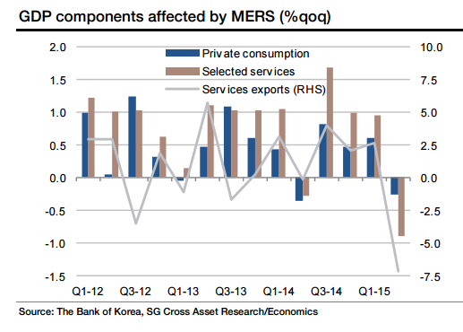 South Korea's Q2 GDP data clearly shows that the weakness in GDP growth was mostly driven by MERS concerns that should be temporary. In the breakdown by expenditure, we watched the contraction of private consumption (qoq growth fell from 0.6% in Q1 to -0.3% in Q2) and services exports (from 2.6% to -7.2%, due to the decline in incoming foreign tourists).