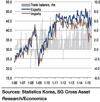 "The trade surplus is expected to decline from $10.0bn to $5.1bn, a natural outcome from weak exports and strong imports", added Societe Generale.