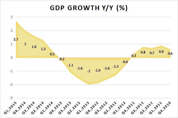 - In the first quarter GDP rose by 2.7% from a year ago. Quarterly growth was 0.9%. Retail sales grew too by 4% in April from a year ago, as sentiment improved. It can be declared that growth crisis is over for Spain.