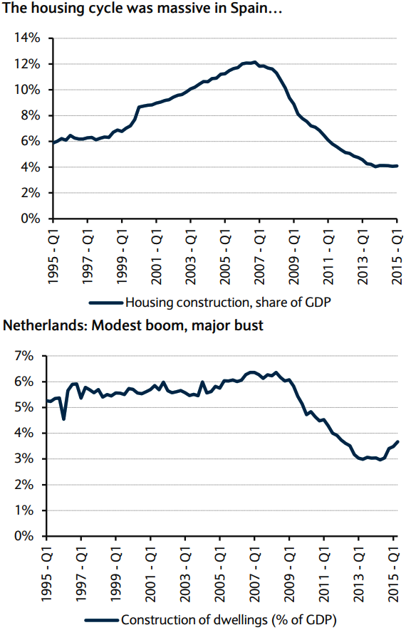 In contrast, some smaller countries experienced substantially more disruptive housing cycles, and these fall into at least two patterns. The Netherlands is interesting: although its construction boom was mild, it suffered a very disruptive bust. From its 2008 peak, housing construction fell for five full years, finally bottoming at 3% of GDP, roughly 2.5pp below the pre-boom norm.