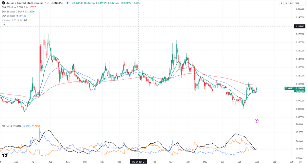 XLM/USD is consolidating after surging more than 45%. The pair hit a high of $0.1120 and is currently trading around $0.1047.
