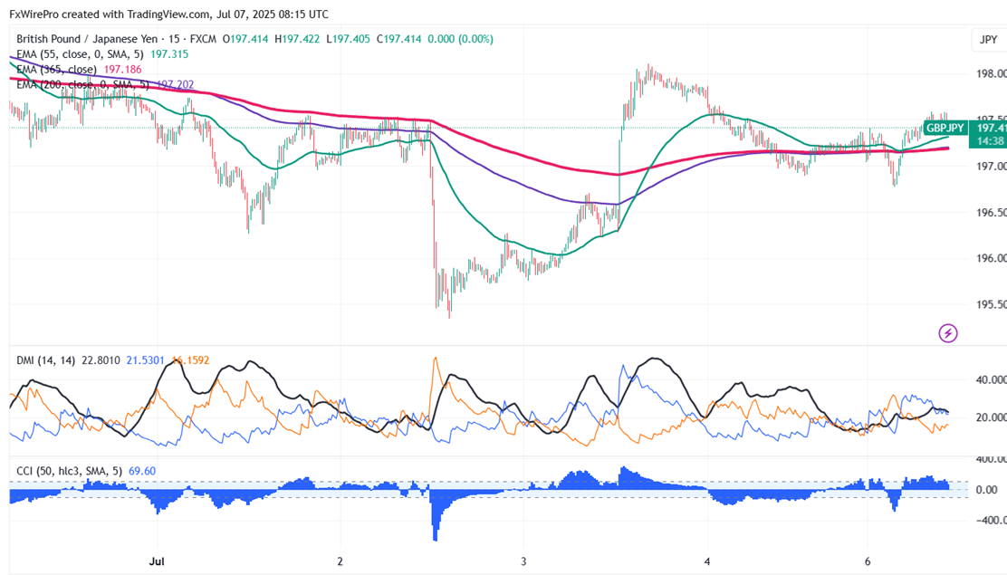 The GBP/JPY pair is trading above 55 and 200 EMA (Short-term) and 365 EMA (long-term) on the 15-min chart, confirming a bullish trend. Any violation below 197 indicates the intraday trend is weak. A dip to 196.70/196.25/195.25/194/193.70 is possible. Immediate resistance is at 197.75, a breach above this level targets of 198.35/198.80/200/202.