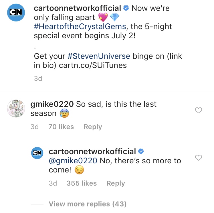 The following month, the official Cartoon Network Instagram page subtly confirmed that there will be a “Steven Universe” season 6. When a worried fan asked if season 5 is the franchise’s finale, Cartoon Network said, “No, there’s more to come!”