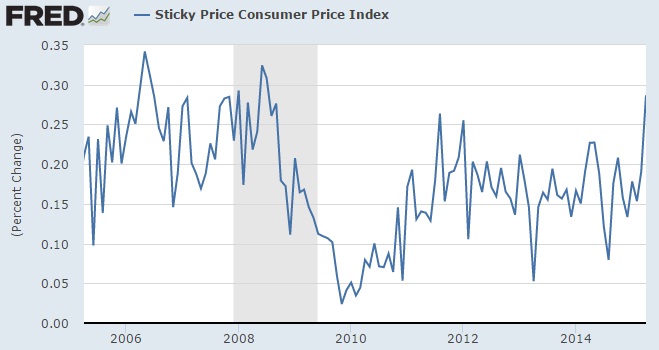 - In April 2015, Sticky price consumer price index rose to highest level since 2008 crisis to 0.286% percent. Annualized sticky price CPI rose to 3.5%in April.