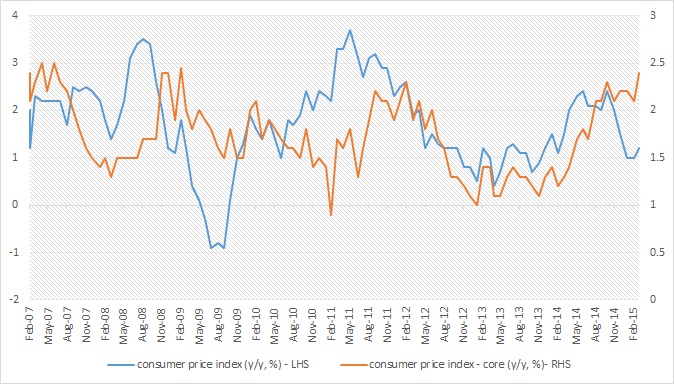 - However core inflation has remained steady in spite of recent drop in energy prices and rising steadily from 1% in 2013 to 2.4% as of March, 2015. Core inflation rate now stands very close to pre-crisis level of 3%.