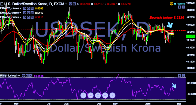 We prefer to take short position in USD/SEK around 8.4450, stop loss 8.5188 and target 8.4078 levels.