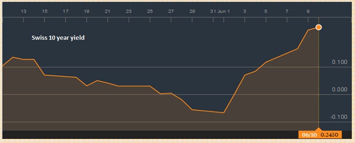 Swiss yield may not see spectacular rise that of bund, however inflation concern over the longer term are likely to push yields higher over the medium term.