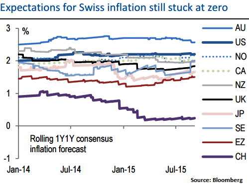 By 2016, Switzerland is expected to be the only G10 country with inflation still hugging zero. The SNB does not expect inflation to turn positive until early 2017 and it expects to keep rates at -0.75% throughout the forecast horizon. But the combination of previous CHF appreciation, lower commodity prices and slack in the economy all conspire to keep inflation soft and CHF slowly trending lower.