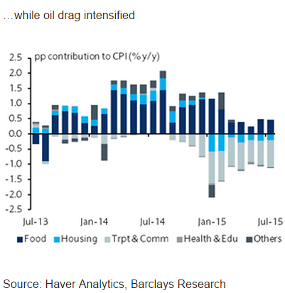 "We still see no deflationary risk, as core inflation will likely continue to be supported by solid domestic demand. Indeed, the release of Q2 GDP showed no signs of any slowing in domestic consumption, with private consumption growing at a solid pace of 2.8% y/y in Q2 (Q1: 2.5%). As such, we maintain our 2015 inflation forecast at -0.1% and expect inflation to rebound to 2.1% in 2016, on account of a low base and subsequent pickup in oil prices," notes Barclays.