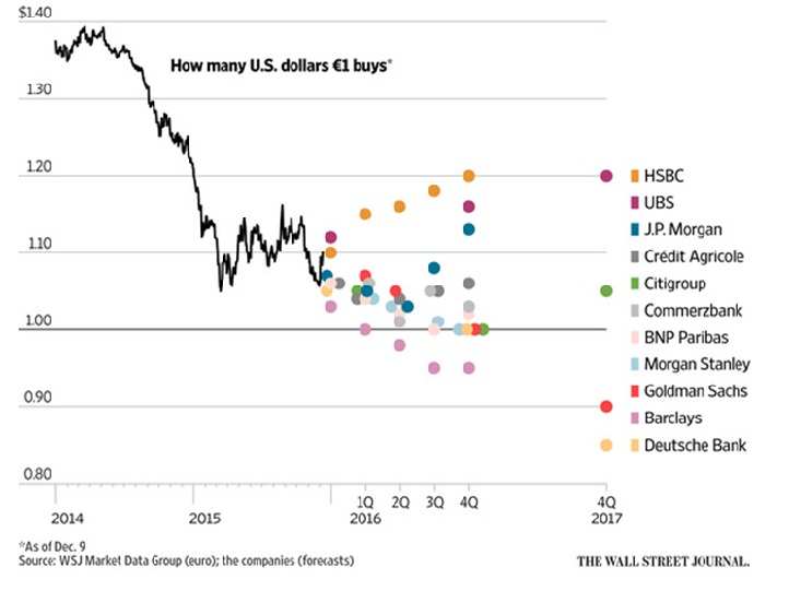 Survey by Wall Street Journal (shown in figure), shows investment banks are well divided in their expectations for Euro/Dollar path next year and beyond.