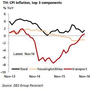 Transport inflation came in at 0.5 percent y/y in November, fastest since mid-2014. Having seen the end of this year’s low oil price distortion, transport inflation is expected to continue trending higher into 2017, DBS reported.