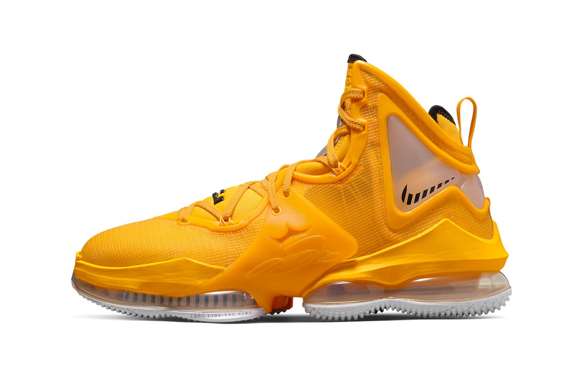 The yellow foundation is offset by black accents like as the LBJ logo and the hazard-striped Swoosh on the lateral ankle.